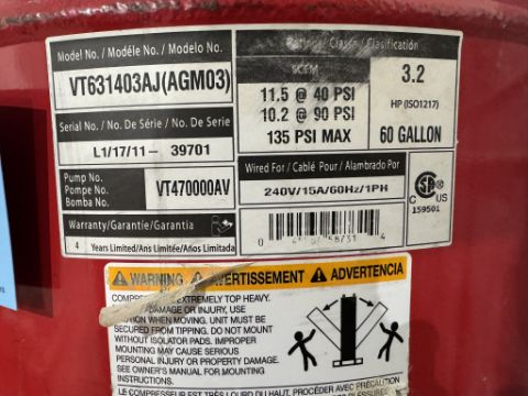 Husky Air Compressor, 60 Gallons, Serial Number L1/17/11/39701