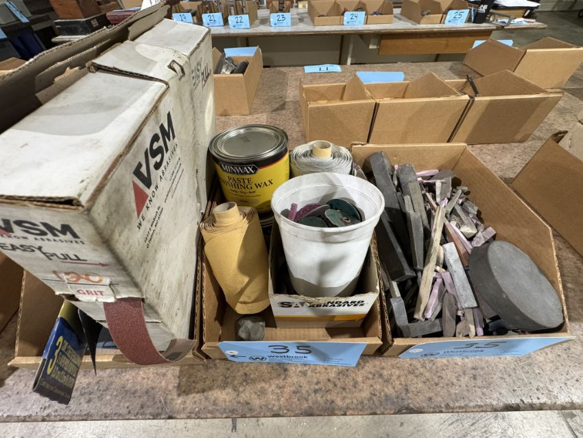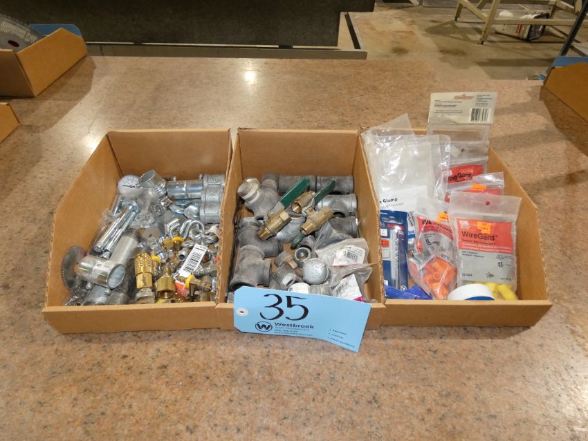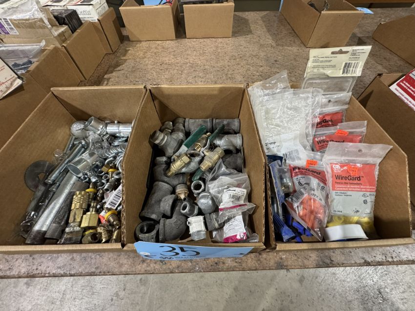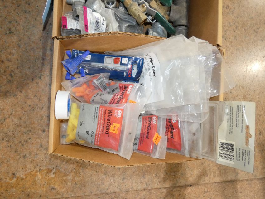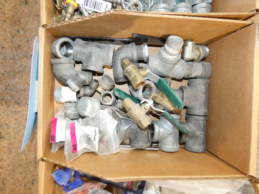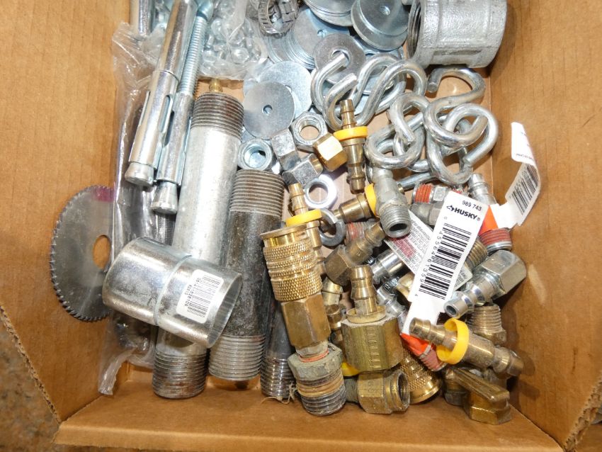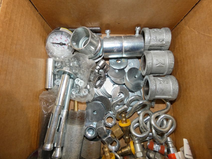 Lot - (2) Boxes of Assorted Hardare, Includes Wire Guards, 3/4 Pipe Clamps, Assorted Plumbing/Hydraulic Fittings, Assorted Washers, S Hooks, Tank Nipples, Nuts, (2) Boxes of Assorted Sanding Discs/Paper, Includes Standard Abrasive Sanding Discs, (1) Roll P100 Sanding Paper, (1) P180 Sanding Paper, (4) Diablo Sand Disc Grit 120, (1) 3M Sand Sheet Grit 80, (1) VSM Sanding Roll Grit 120, Misc. Sand Paper, and Assorted Slate Pencils