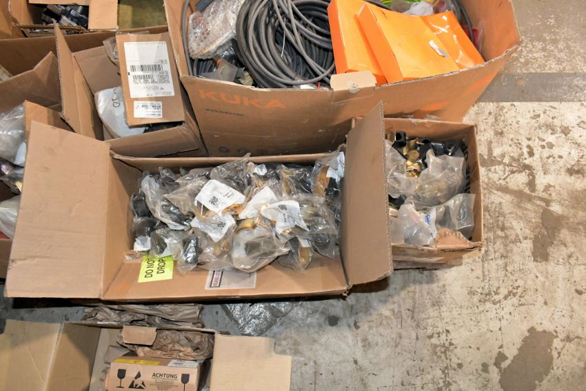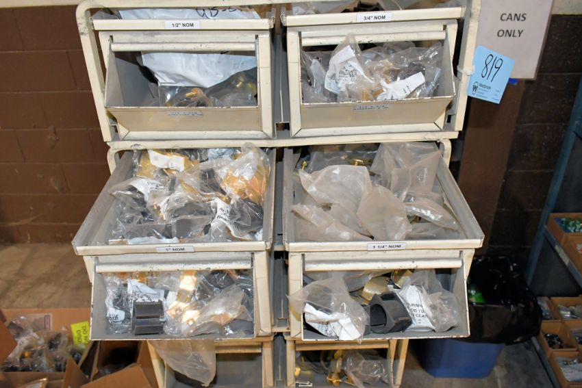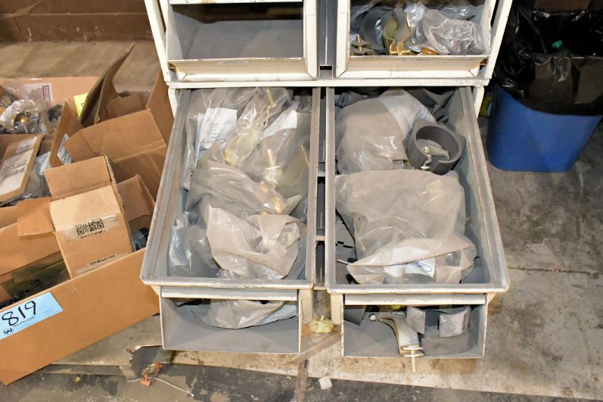 Lot - Pipe Clamps, Valves and Automation Cables on (1) Pallet and in (14) Steel Bins with 14-Drawer Steel Bin Organizer