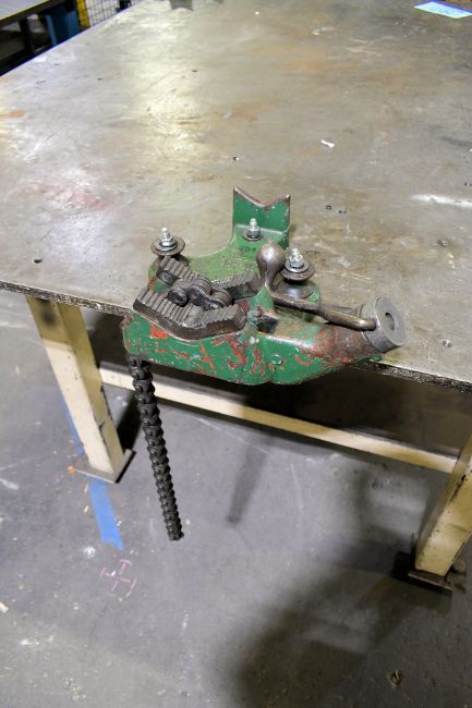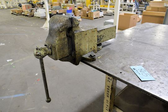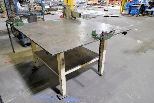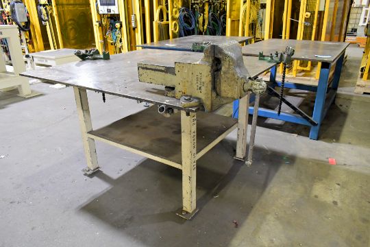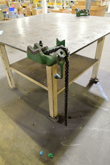 60" Long x 64-1/2" Wide x 3/4" Thick Steel Table with Yost 7" Bench Vise and Ridgid Model BC-610 Chain Vise (Contents Not Included) (Not To Be Removed Until Empty)