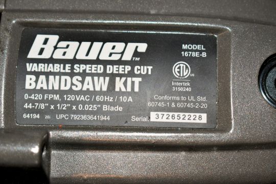 Bauer Model 1678E-B Variable Speed Deep Cut Portable Electric Band Saw with Case, s/n 372652228; 420 FPM, 10 Amp, 120 Volt