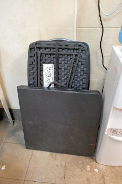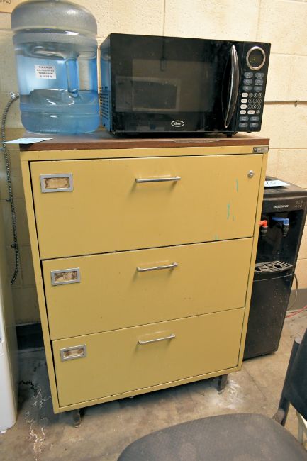 Lot - 3-Drawer Lateral File Cabinet, Lockers, Chairs and (2) Plastic Folding Tables