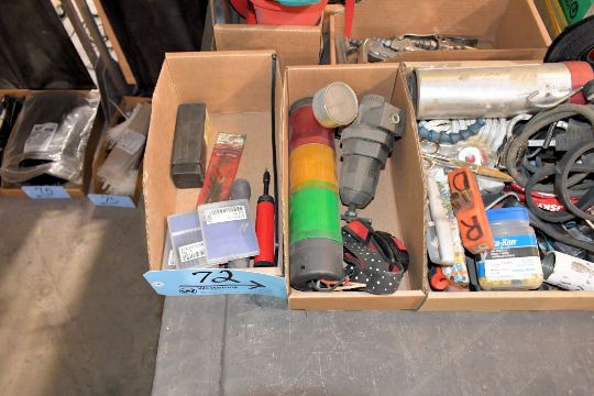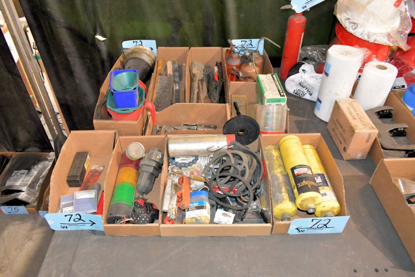 Lot - Various Hand Tools in (10) Boxes, Including: Funnels, Brushes, Wheel Dresser, Rivet Tool, Oilers, Shim Stock, Air Blow-Off Tools, Deburring Tools, Bernz-O-Matic Cylinders, Bungee Cords, Utility Knives, Scissors, Etc.