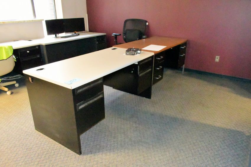 Lot - (4) Desks, (1) Table, (1) Wood Cabinet, (1) 2-Door Supply Cabinet, (1) 4-Drawer File Cabinet and (1) 2-Drawer File Cabinet