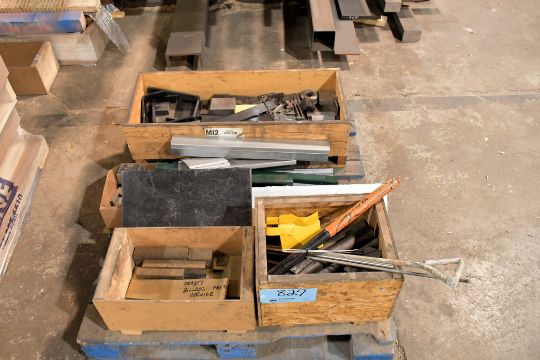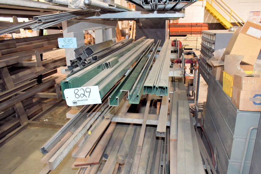 Lot - Flat Bar Stock, Solid Round Bar Stock and Wire Ducts on (1) Rack with Steel and Brass on (1) Pallet and Metal Chips in (3) Uline Waste Cans (Rack Not Included)