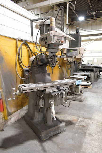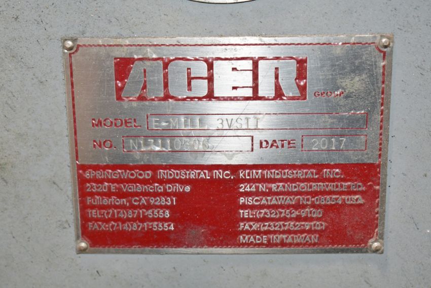 2017 Acer Model E-Mill 3VS-II 3 HP Vertical Milling Machine, s/n N17110306; Newall Model DP700 2-Axis Digital Readout, 60 to 4,500 RPM Spindle Speeds, 9" x 49" Power Feed Table, Maxi Torque-Rite Power Drawbar, 1-Shot Lube, Way Covers, Work Light