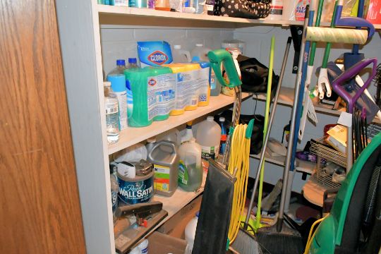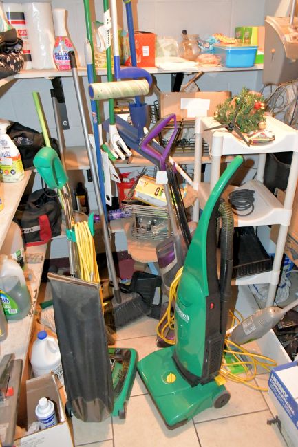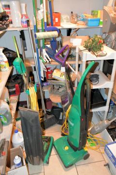 Lot - Janitorial Supplies in Closet, Including: (2) Upright Vacuums, Cart, Brooms, Dust Pans, Cleaning Sprays, Safety Glass Dispensers, etc.
