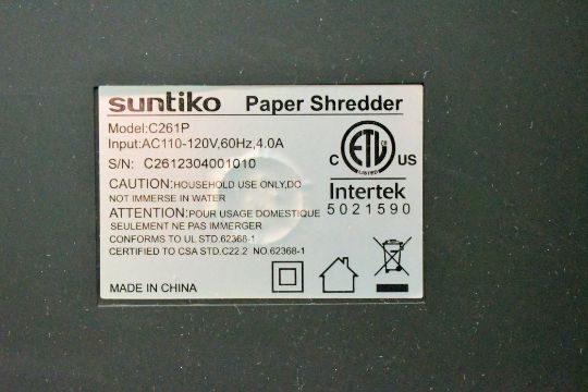 Suntiko Model C261P Document Shredder, s/n C2612304001010