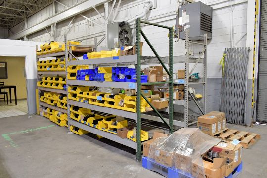 Lot - (3) Sections of 96" Wide x 36" Deep x 96" High Pallet Rack with Steel Grate Decking, (1) Section of 96" Wide x 30" Deep x 96" High Pallet Rack with Steel Grate Decking and (1) Section of 84" Wide x 24" Deep x 87" High Shelving (Contents Not Included) (Not To Be Removed Until Empty)