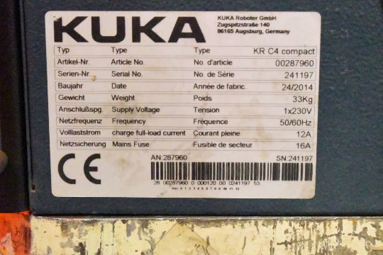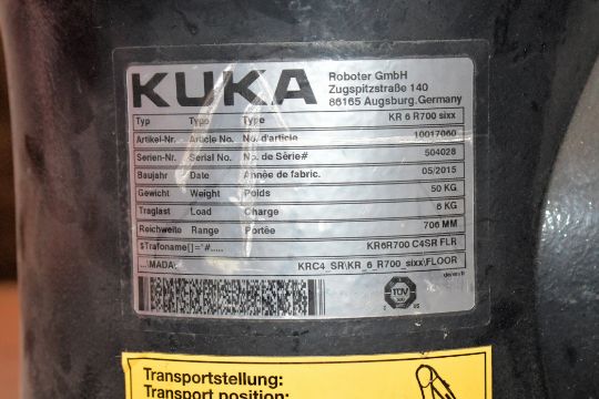 2015 Kuka Model KR 6 R700 Sixx 6-Axis Table Mounted Robot with 48" Long x 72" Wide x 1" Thick Steel Table, s/n 504028; Kuka Model KR C4 Compact Controller, s/n 241197, 706mm Range, 6kg Load
