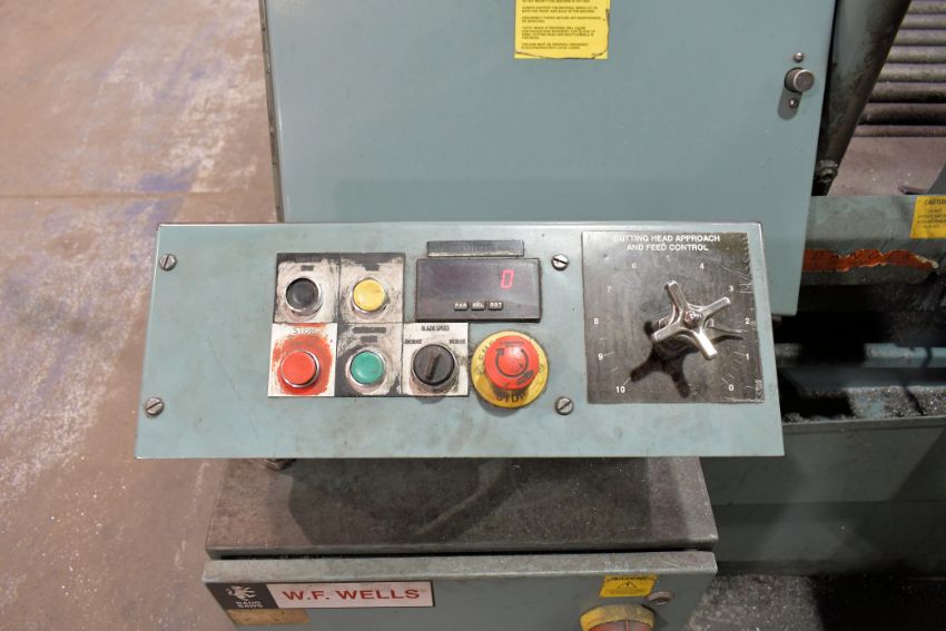 W.F. Wells Model F-16-1 16" x 20" Twin Post Semi-Automatic Horizontal Metal Cutting Bandsaw, s/n A4069/F181061; 1-1/4" Blade Width, Automatic Down Feed, Manual Clamping, 24" x 120" Roller Infeed Conveyor, Work Light, 7.5 HP, 220 Volt, 3 Phase