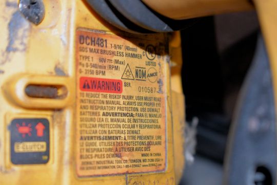 DeWalt Model DCH481 Type 1 1-9/16" 60 Volt Cordless Hammer Drill, s/n 010587; 540 RPM, 3,150 BPM (Battery and Charger Not Included)