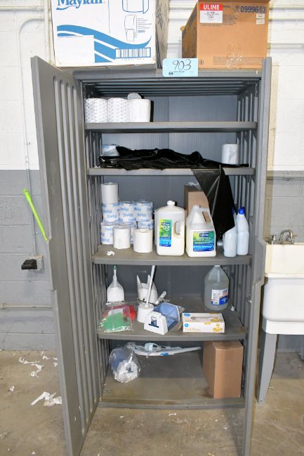 Lot - (1) 36" Wide x 20" Deep x 72" High 2-Door Supply Cabinet and (1) 30" Wide x 18" Deep x 72" High 2-Door Supply Cabinet with Janitorial Supplies